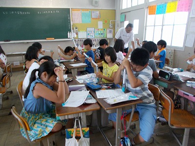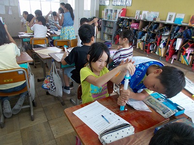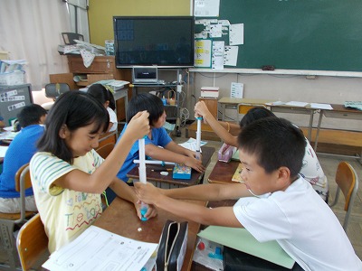 理科では,閉じ込めた空気と水を押すとどうなるかの実験をしました。