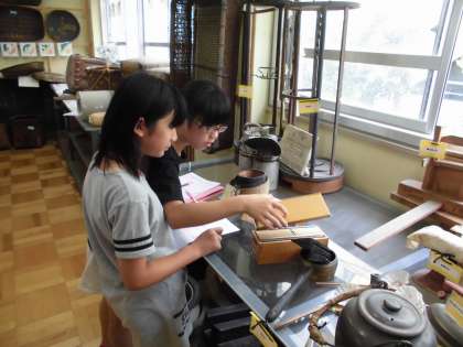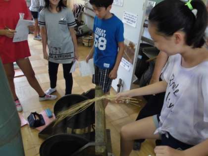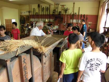 郷土資料室には,米づくりの道具も多く展示してあります。大型の水車をはじめ,もみ殻を風の力で飛ばす「とうみ」や足でペダルを踏み回転させる「脱穀機」,田下駄や鍬などの道具など当時の暮らしが目に浮かんできそうです。また,火鉢やおふろ,糸車などいろいろな道具が展示してあります。子どもたちにとっては,とても新鮮な昔の暮らしを体験することができる時間となりました。