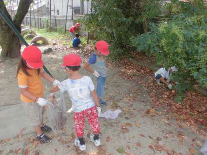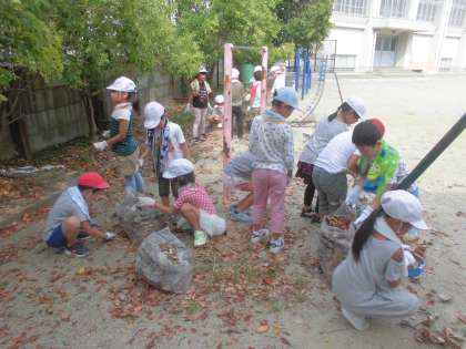 今日は,1時間目から校内の草抜きや落ち葉拾い,石拾いをしました。2年生は,ブランコの周辺の落ち葉をたくさん拾いました。