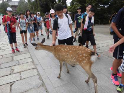 奈良公園や東大寺の参道には,たくさんの鹿がのんびりと暮らしていました。子どもたちは驚きながらも興味津々という感じで鹿と仲良くしていました。とても人懐っこい鹿たちでみんなを迎えてくれているようでした。