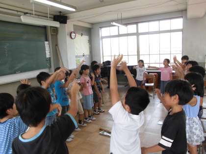 音楽がなめらかになると,それまで縦のりだった体が横に動きだしたり,「キラキラ」という歌詞があると手を星が瞬くように動かしたり,「ゆめをえがくよ」のところで空に向かってにじを書くように手を動かしていたり・・・