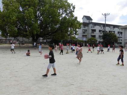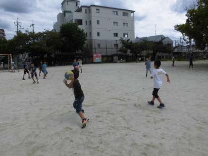 得意な人もそうでない人もいますが,早々に外野に出てしまった人が内野の人と交代できるというルールを子どもたちでつくって遊んでいました。