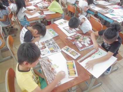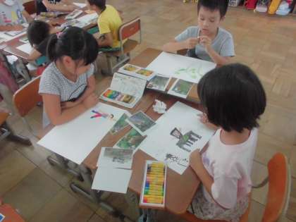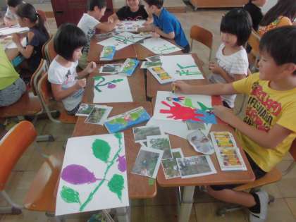 生活科の学習では,夏休み中に大きく生長した野菜の様子をまとめて発表の準備をしています。ナス・キュウリ・ミニトマト・サツマイモ・オクラ・ピーマンのグループにわかれて,今までの観察で気づいたことを絵や文にしています。