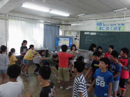 英語の学習の時間にはALTの先生や中学校の英語の先生と一緒に学習をすることが多いです。今日の英語の時間には,中学校の英語の先生と建物の名前を英語で発音したり,自分たちができることを英語で話したりしました。また,二人組で会話をしたり,みんなで楽しみながらゲームをしたり,歌を歌ったりもしました。いろいろな街のことについても音声を聞いて考えることもできました。
