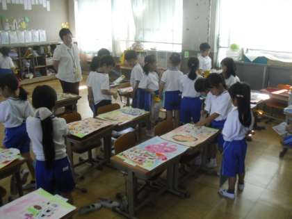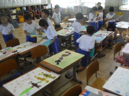 図工の時間に,1組,2組合同で「お話の絵」の鑑賞をしました。