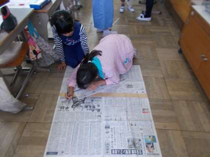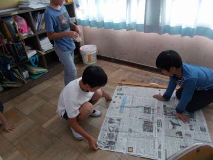 1平方メートルに子どもが何人乗れるか調べた後(なんと19人も乗れました!),1平方メートルを新聞紙で作ったり,黒板や廊下に並べて敷き詰めて何平方メートルかを調べたりしました!