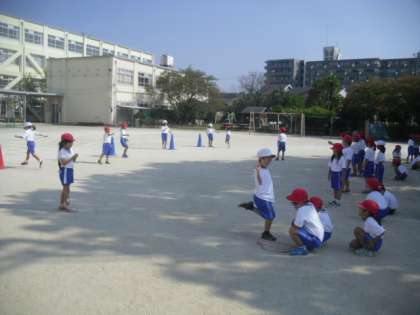 幅跳びの運動につながる遊びです。じゃんけんをして,「チヨコレイト」と進んで相手と競い合う「じゃんけんとびくらべ」や,川に見立てた場所や島を飛び越える「川・島とびくらべ」などで遊びました。