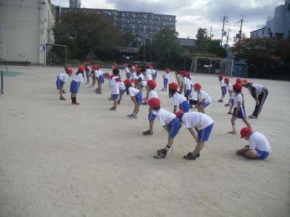 活動の初めの準備体操は,みんなで進めることに挑戦しています。担任のアドバイスを受けながら,日直さんが前に出て,活躍してくれています。
