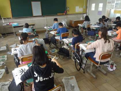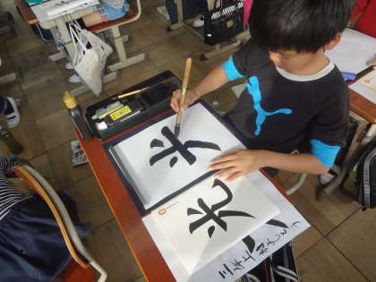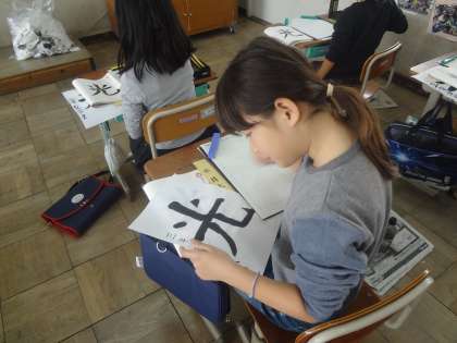 毛筆書写 「光」 公開日 2018/11/16 更新日 2018/11/16 3年生の部屋 今週の書写は,書き初め展に向けて「光」を書きました。 1時間ずつ,2日間かけて書き上げました。 今日は,1時間目に書いた自分の字と手本を見比べ, 気を付けて書きたいポイントをイメージしながら集中します。 始筆に気を付けて, 力強いのびやかな字で書き上げることができました。