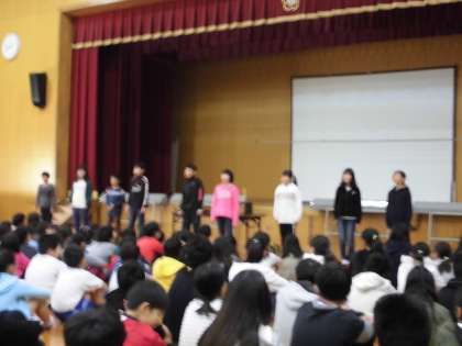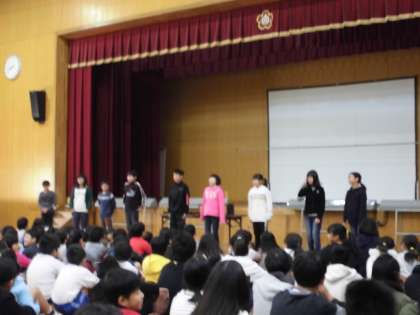 児童朝会で,給食委員会と