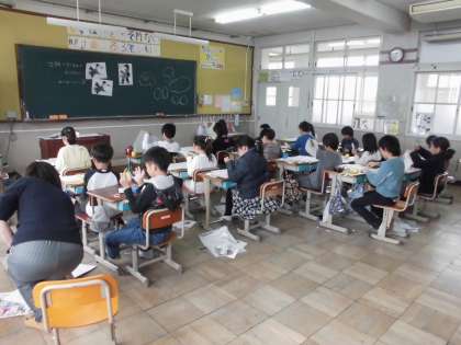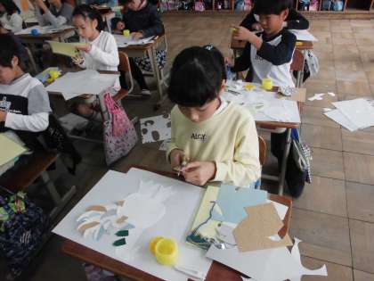 毛糸やアルミホイル,ぎざぎざのダンボール,和紙,プチプチなどの素材を切って貼って,鳥の体をつくっていきます。