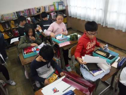 家庭科の学習では,家から持ってきた空箱を再利用し,お道具箱の整理をしました。