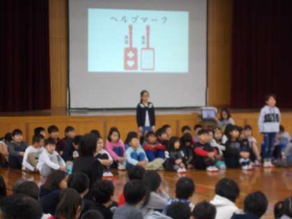 今日の人権集会,4年生は「だれもが関わり合えるように」で学習したことを発表しました。