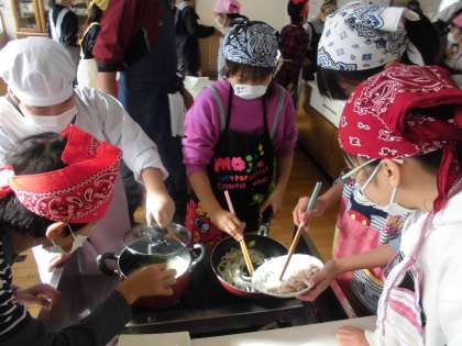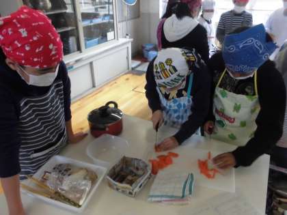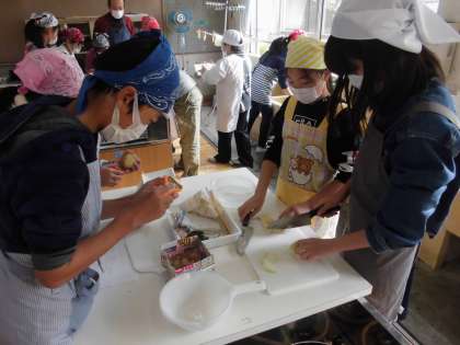 12日(水)に家庭科の調理実習で「ジャーマンポテト」と「野菜のベーコン巻き」のどちらかを作りました。子どもたちは,事前に考えた分量や手順通りに上手に進めていました。また,役割分担を決めていたので調理がとてもスムーズでした。鍋を使ってゆでる野菜や,炒める野菜に分けたり,火加減や野菜の切り方を考えながら,班で協力して作りました。また,グループごとに協力し,準備や片付けも自分たちでがんばり作りました。慣れた手つきで野菜を切ったり,味見をしながら味付けをしたりと,子どもたちの調理の手際のよさにとても驚きました。