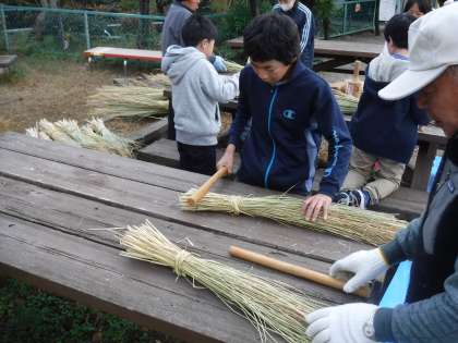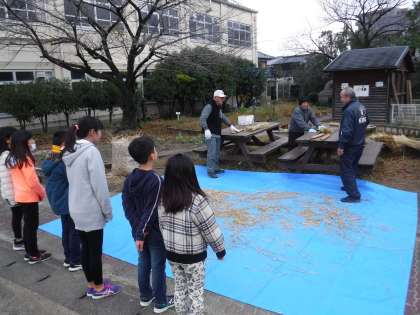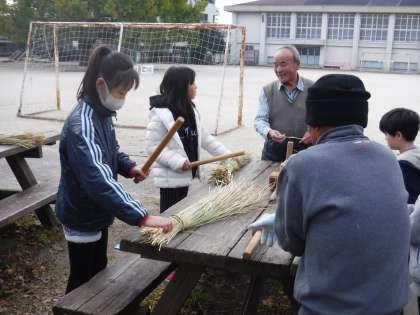 藁打ち体験 公開日 2018/12/18 更新日 2018/12/18 5年生の部屋 17日(月)に地域の方にお世話になり,「藁打ち体験」をさせていただきました。 「しめ縄」を作るために,このような作業が行われていることを子どもたちは知らなかったので,苦労して作られているということを改めて知ることができました。 今回は,その藁を使って「リース作り」に挑戦します!