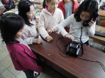 また,映像の途中に出てきた黒電話は,実物を触って体験しました。