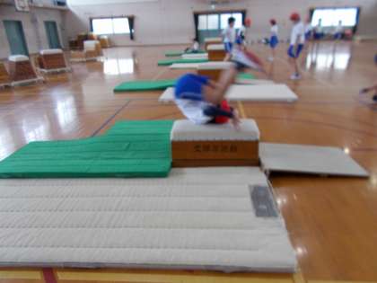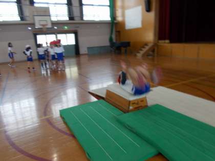 跳び箱は,みんなで台上前転の練習をしました。