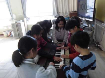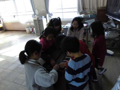 今練習している曲を弾いたり,発表会でやる曲を弾いたり,「ねこふんじゃった」にはまってずっと練習していたり,「合奏」と言って三人くらいで音を鳴らしたり,面白そうにそれを見ていたり。