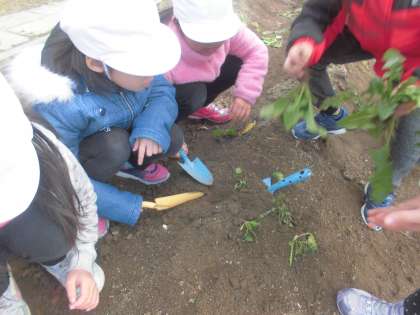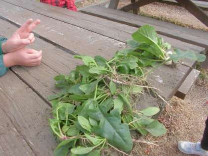 生活科の学習では,「冬の野菜」ほうれん草とかぶを収穫しました。先週までは,大きなかぶが土の中から顔を出しでおり収穫を楽しみにしていたのですが,三連休の間に「カラス」に食べられてしまいました。「一歩遅かった…。」と,残念そうな子どもたちでしたが,農家の方の苦労や思いを少しですが感じることが出来たようです。