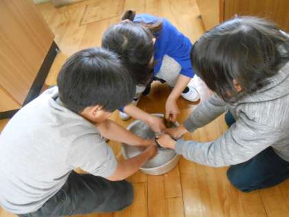 もう片方は,ぬるま湯に洗剤を入れて手洗い。