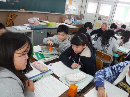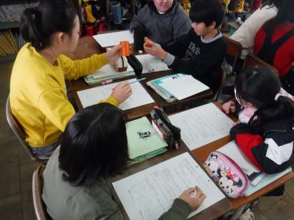 算数の学習は,角柱と円柱について模型を使いながらくわしく調べる学習に取り組みました。