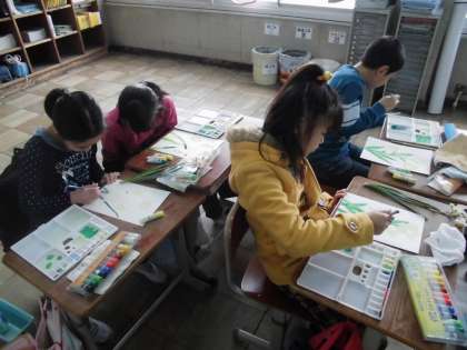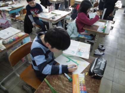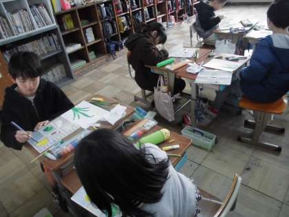 図工 面相筆をつかおう 公開日 2019/02/14 更新日 2019/02/14 3年生の部屋 前回スケッチしたスイセンを,今日はいよいよ面相筆を使って描きました。 葉の色や花弁の重なりを,実物をよく観察しながらかきます。 「花弁は白」,「葉っぱは緑」という決まり文句のような世界ではありません。 根本は濃く,葉先に向かってどんどん色が変わっている…そういったことをよーく見て, パレットで色を調節しながら描いていました。 教室に飾る予定です。ぜひご覧ください。