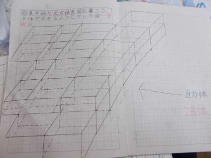 見取り図は,斜めの辺をきちんと平行に同じ長さにかくのが難しいので,ちょっと苦戦をするところです。