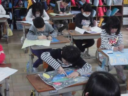 図画工作科では「まどをひらいて」の学習では,カッターナイフを使用して作品を仕上げました。カッターナイフの正しい使い方を学んでから緊張感をもって作品を仕上げていました。みんな,真剣な顔でとても集中していました。