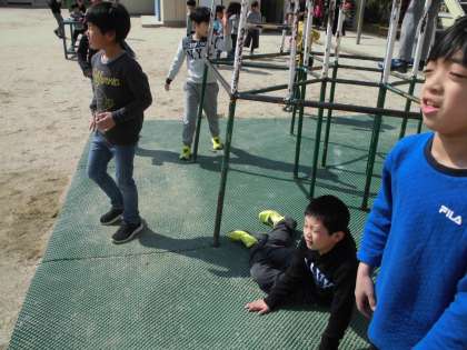 ロング昼休み 公開日 2019/03/05 更新日 2019/03/05 3年生の部屋 明日明後日と雨がつづくかもしれませんし,今日みたいな天気の日は外に出ないともったいない!と,ロング昼休み,みんなで遊びに出ました。 けいどろとおにごっこをしました。 給食のチャウダーがボリューム満点だったのもあり,「体が重い」と言いながらも元気に走っていました。 逃げ足の速いこと。 みんなが速くなったのか,私が遅くなったのか…。