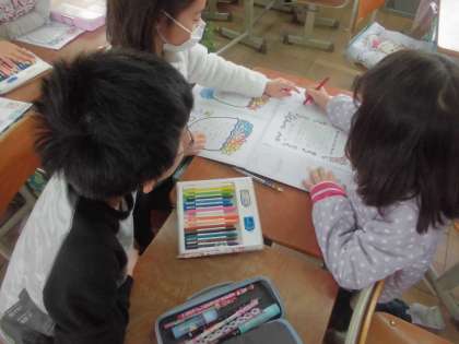 生活科では,「大すきいっぱいわたしのまち」で地域のお店に行かせていただき,インタビューをさせてもらいました。感謝の気持ちを伝えようと,子どもたちはみんなで工夫して作成していました。来週,お店に行ってお手紙を渡したいと思います。