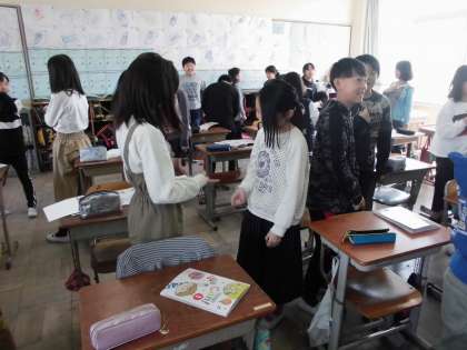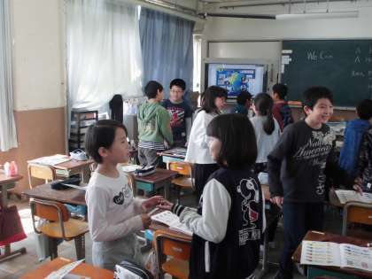 18日2校時に外国語活動「Hello,everyone」を学習しました。二人組になり,英語で名前や「How are you?」と聞いて答えるなど楽しく取り組みました。できるだけ,たくさんの人と関わる目標をもつなど意欲をもって笑顔で英語を使っている様子が印象的でした。