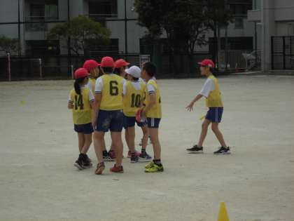 体育の時間にリレーに取り組んでいます。バトンパスをどうしたら,早くできるのかチームで話し合ったり声をかけあったりと励ましあいながら学習しています。