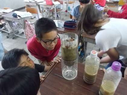 授業の最初から最後までかけてこしていた泥水を,こす前の泥水の色と比べてみました。