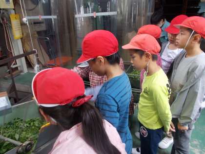 摘んだ茶葉がどうなるのか,出荷されるまでの道のりを,工場見学させていただきました。