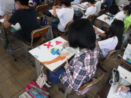 平和ポスター 公開日 2019/05/22 更新日 2019/05/22 6年生の部屋 図工の学習では,平和ポスターを描いています。 下書きを丁寧にしている子や順調に進み色塗りに入っている子など様々ですが,自分の思いをしっかりと絵に表わしているように思います。 来週ごろには完成する人が増えそうですね!