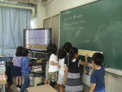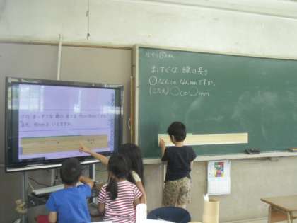 細かいミリメートルの長さをはかって,目盛りを読むことに苦戦していたので,黒板用の大きなものさしで練習しました。