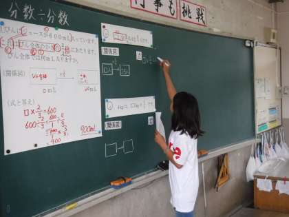 今日の算数では,分数÷分数の内容だけではなく,5年生の割合や単位量あたりの大きさに関係する問題に挑戦しました。