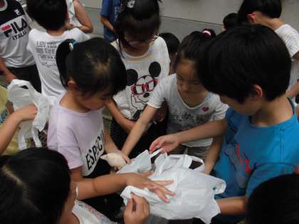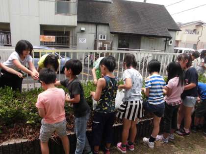 まず,体育館の裏にある,茶畑のお茶を摘みに行きました。 10分ほどでしたが,400グラムくらい摘めました。