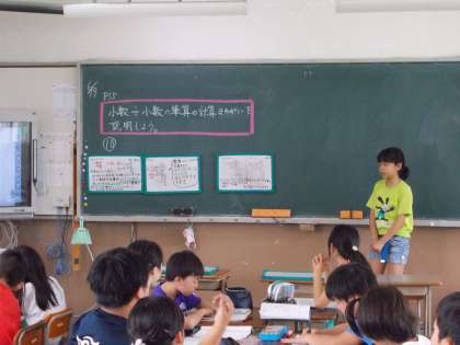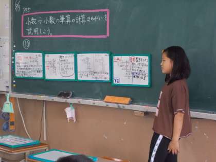 わり算の筆算のまちがいを説明するために,役割分担してホワイトボードに書いて,また,ノートにも書いて説明しやすいように準備しました。