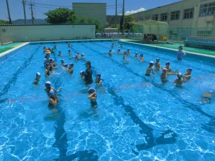 先週は,低水位で水遊びに親しみましたが,今週からは通常の水位で「水遊び」を行いました。ヒトデやだるまに変身して浮く練習をしたり,ロケットやカニに変身したりしました。