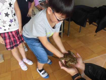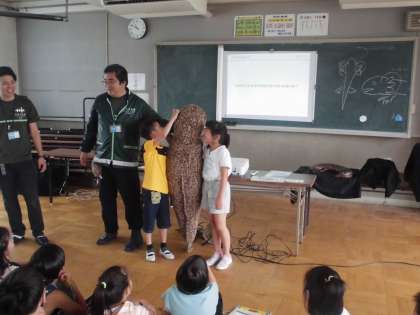 7月4日(木)に京都水族館から3名の先生にお越しいただき,オオサンショウウオを中心に両生類についてお話をしていただきました。今日の学習は,京都市内にも生息しているオオサンショウウオの生息環境を守ろうとする取組から,地球全体の自然環境のあり方について,人間だけでなく生き物の立場で考えることをねらいにされた学習でした。天然記念物でもあるオオサンショウウオの実物大の模型の大きさには驚きました。小学校の4年生のみんなと同じくらいの大きさでした。また,アカハライモリやヒキガエルなどの両生類の仲間なども紹介していただき,生物の生態についていろいろ教えていただきました。