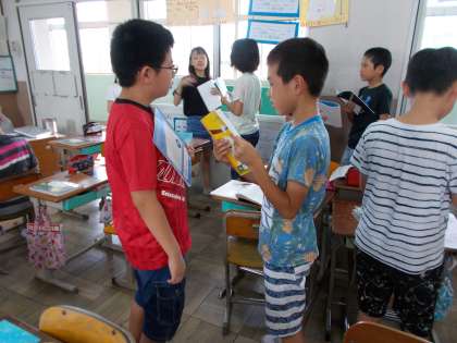 国語の物語文の学習「大造じいさんとガン」で「大造じいさんクイズ」を」作り,中心人物の行動や人柄を考えました。クイズを出し合って,答えを言うなど交流を楽しみました。