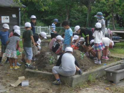 夏野菜の収穫を終えて,草抜きをして準備をしていた畑に,種をまいたり,苗を植えたりしました。