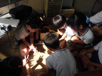 その時に影でできる遊びもいくつか紹介したので,さっそく教室の中で影絵をしてあそんでいました。