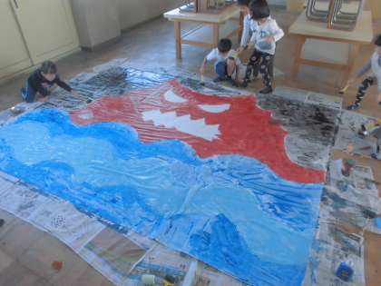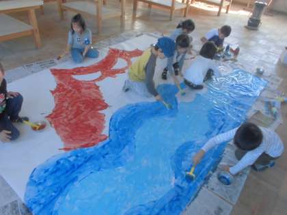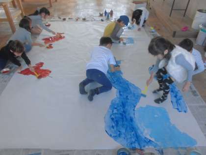 図画工作科「コロコロぺったんシャカシャカ」の学習では,学習発表会に向けて必要な背景を作成しました。