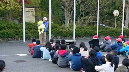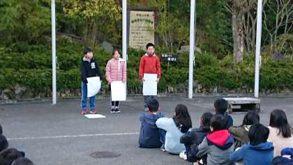 3校合同の朝の集いです。初めは、山の家の先生のお話。向島小学校の学校紹介は、代表がとても大きな声でしっかり行ってくれました。そのほかの人たちも、とてもいい姿勢で立派な態度で参加しました。