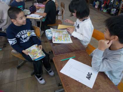 出題者が言ったアルファベットを,教科書の中から見つける学習をしています。