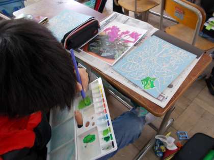 彫った板に色を塗って,黒い紙に写しました。
