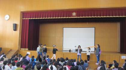 写真のように,くしゃみで5mも菌・ウイルスが飛ぶ,というところではざわめきが。クイズはみんなすらすらと答えていましたが,改めて風邪・ウイルスに気を付けるきっかけになったのではないかと思います。