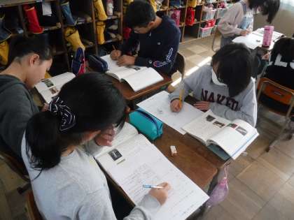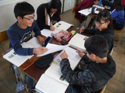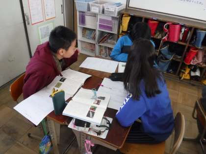 今日は筆者が挙げる事例について班の友達とまとめる活動に取り組みました。